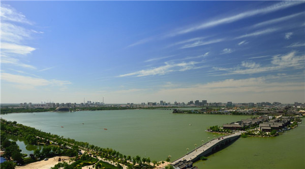 站在橋的最高處,東昌湖水泛泛而來,清澈廣闊的湖水一直延伸到遠(yuǎn)方,湖中的游船星星點(diǎn)點(diǎn),湖光粼粼動(dòng)人,真是一幅優(yōu)美的水墨畫,風(fēng)拂面而來,會(huì)感到十分愜意。