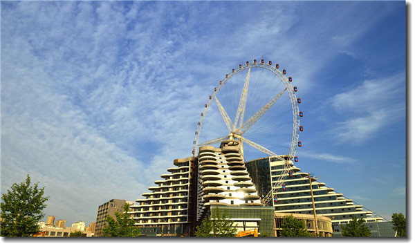 摩天輪總高度133米,是中國唯一一座與建筑融為一體的斜拉索式摩天輪,更是全球首座建筑與摩天輪相結(jié)合的城市地標(biāo),主題建筑為南北兩樓,樓體輪廓呈優(yōu)美的波浪形曲線結(jié)構(gòu),遠(yuǎn)遠(yuǎn)望去,猶如徜徉在東昌湖畔的一艘巨輪。